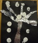 Scheur van aluminiumfolie een boom. Stempel daarna met witte verf sneeuwvlokken.